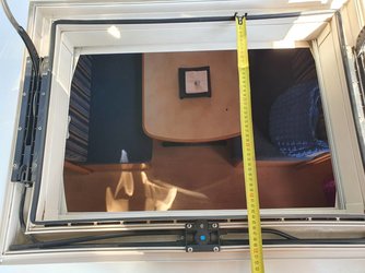 Por otra parte, me dicen que es de 500 x 700 y yo es que ya no se, el marco por la parte de dentro de la caravana, de fuera a fuera son 900 x 600. La luz o hueco de la claraboya son 44 x 65.