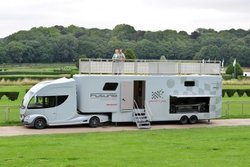 El motor es de 510 CV y alcanza una velocidad máxima de 93 mph. Un dormitorio principal con una gran pantalla de televisión de 40 pulgadas y un cuarto de baño completo con ducha de lluvia. Un salón con calefacción suelo radiante eléctrico. También lleva un dispositivo para disfrutar de internet móvil, una sala de estar, cama litera y una cabina de conducción que, para la mayoría de los conductores, sería un sueño de tener entre sus manos. En la oscuridad brilla su pintura exterior. La parte delantera tiene un diseño aerodinámico y los laterales son abatibles para ampliar el espacio interior. Al toque de un botón, se levanta el techo y se crea una terraza exterior con su apropiada cobertura.